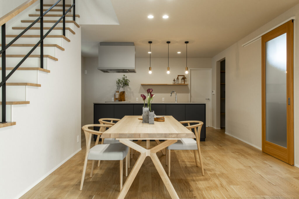 その手前には、ご採用いただいたカリモク家具のダイニングテーブルとチェアを配置。