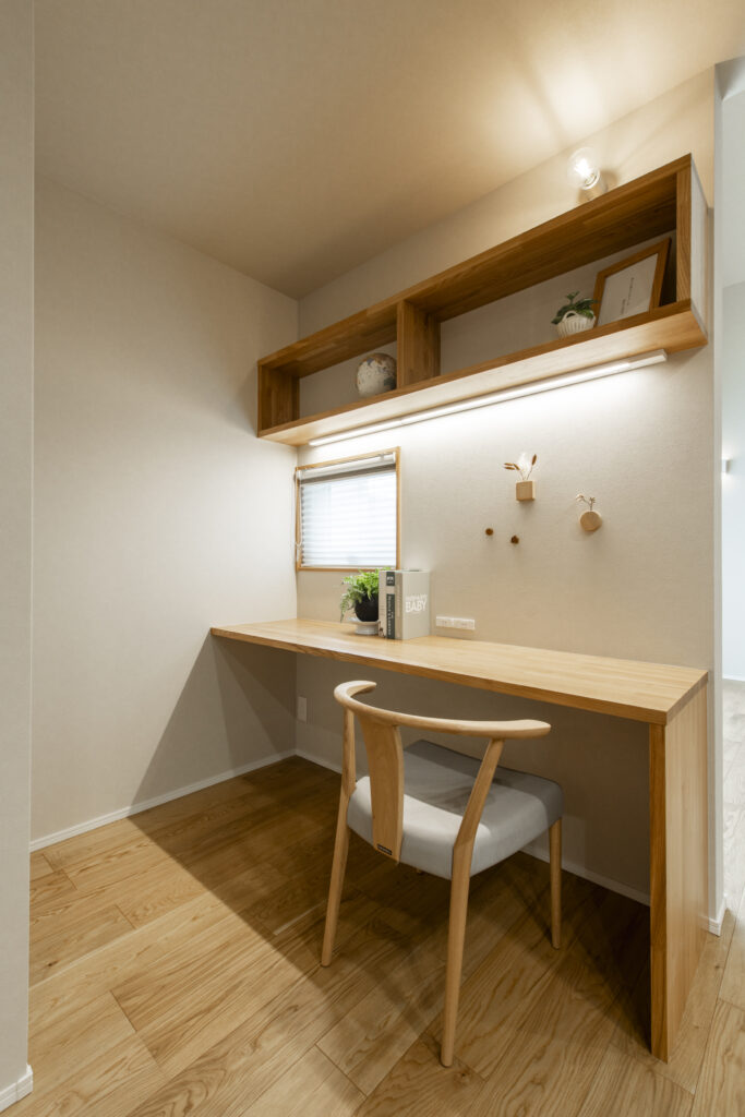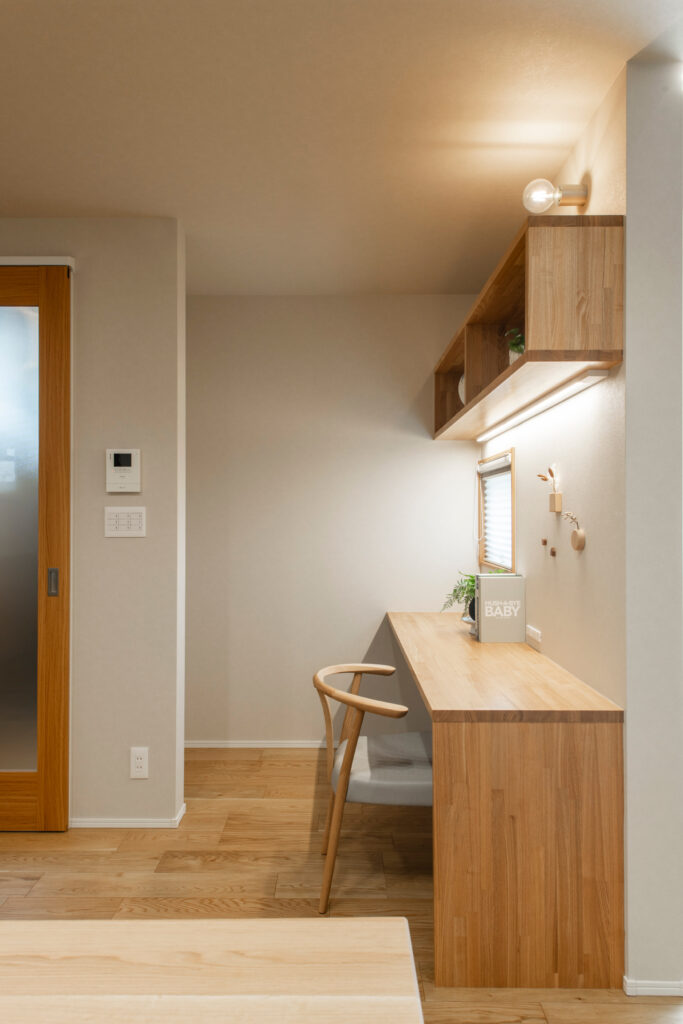 リビングの一角には、キッチンからでもお子さんが勉強している様子を確認できるスタディスペースを。