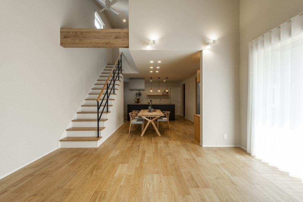 大屋根の構造を生かして、リビングの天井は開放感のある勾配天井に。