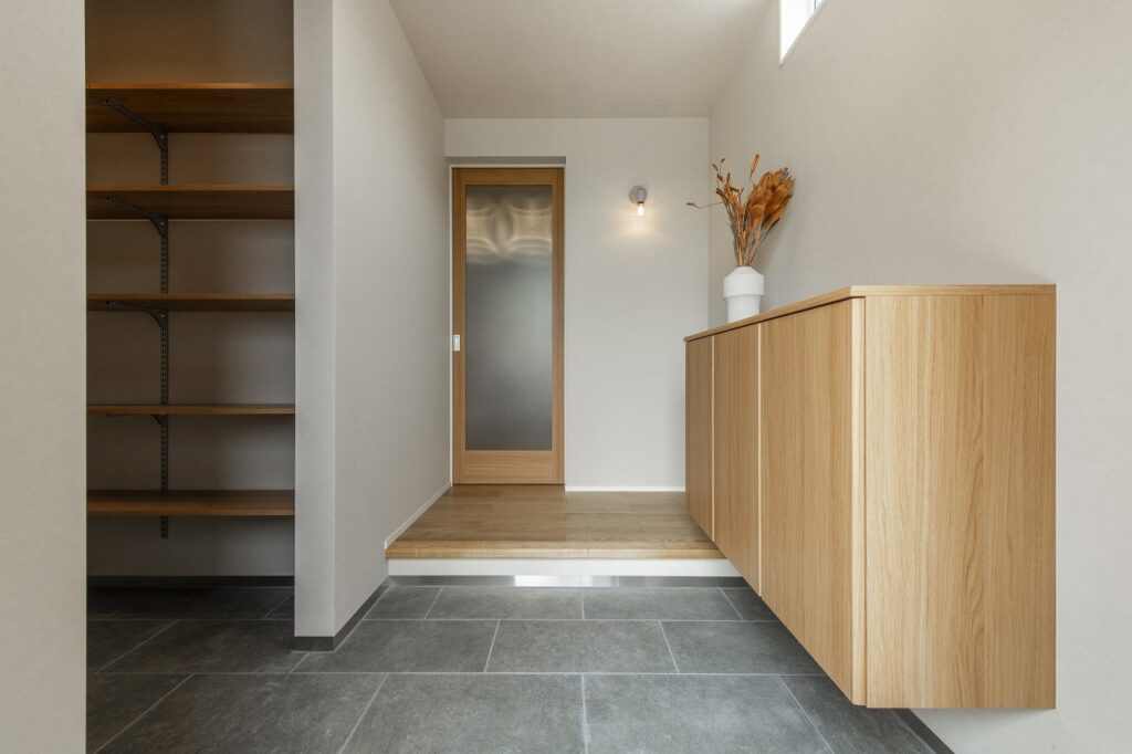 玄関ホールには、出しっぱなしになりがちな靴をすっきりとしまえる収納を使いやすい位置に設けました。