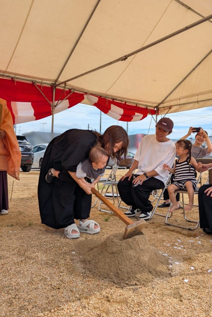 鍬入れの儀では、お施主様に「えい、えい、えい」の掛け声とともに鍬を入れていただきました。