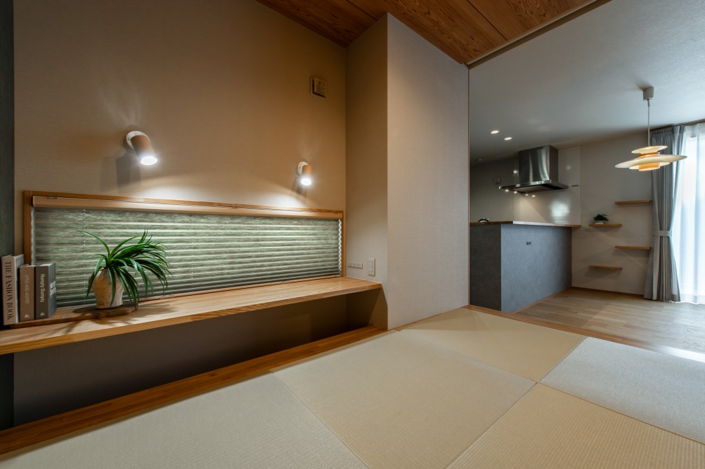 LDKに面したタタミコーナーは小上がりにし、こじんまりと落ち着ける空間に。