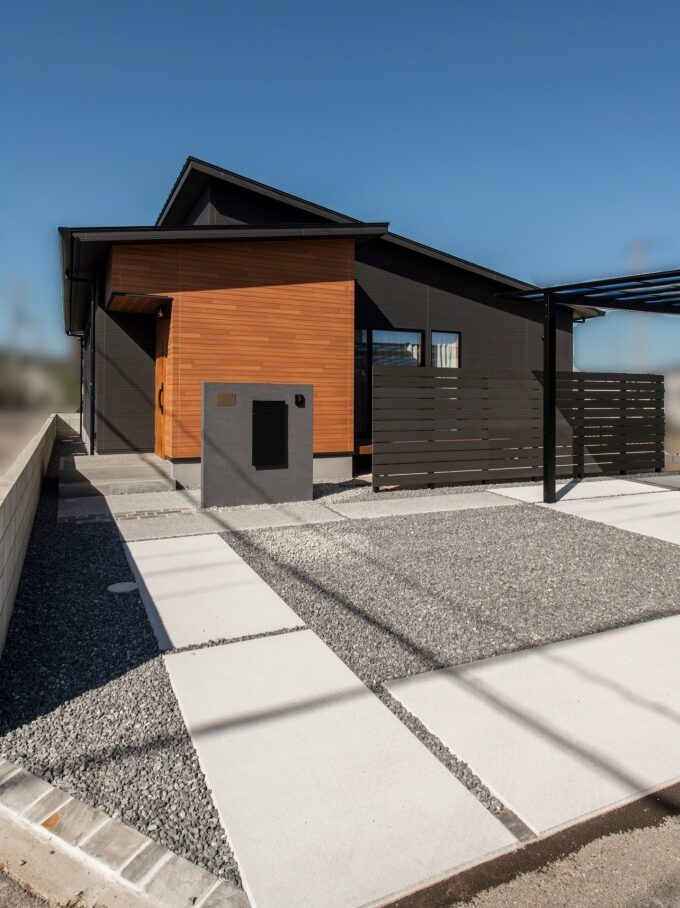 全体を引き締めるブラックの外壁に、木目のあたたかみがプラスされることで、