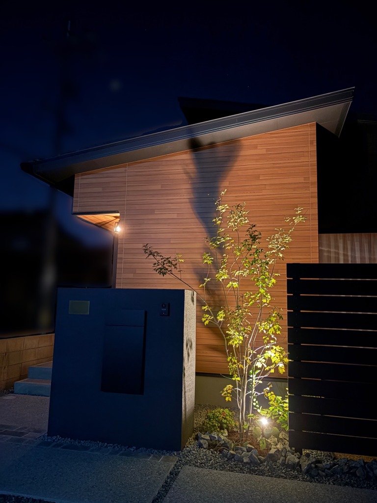 夜になるとライトアップされた植栽の影が木目に映り、玄関までの道しるべのように。