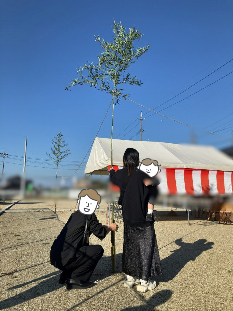 まず初めに、お施主様に四隅の竹のひとつを立てて頂きます🍃