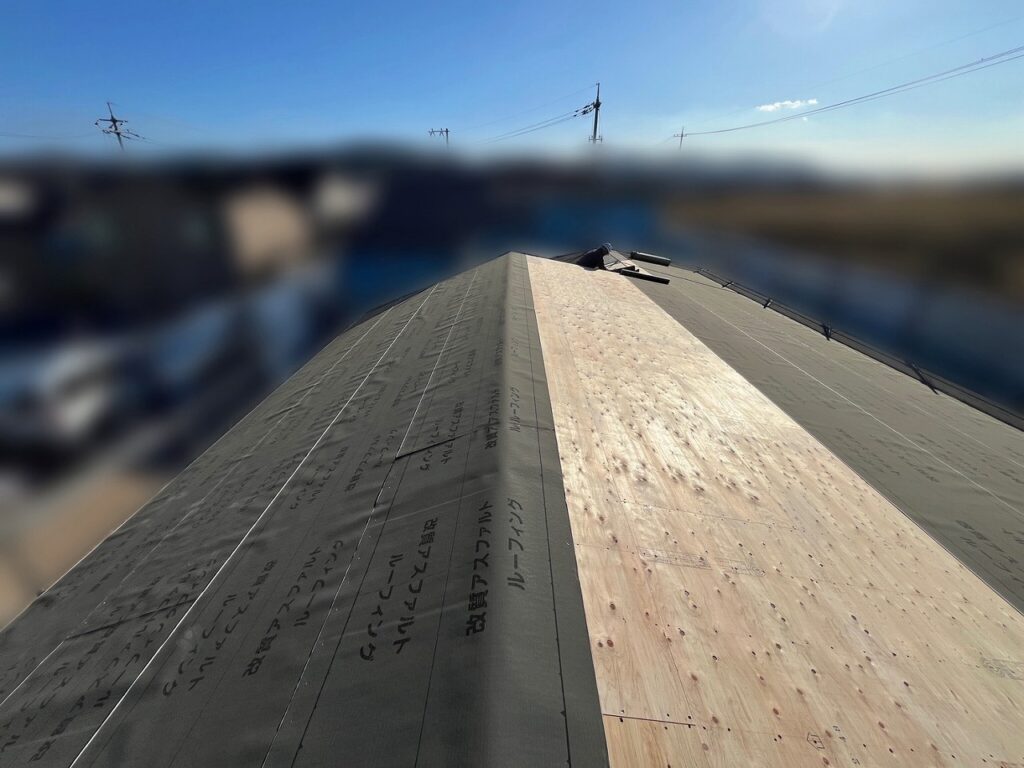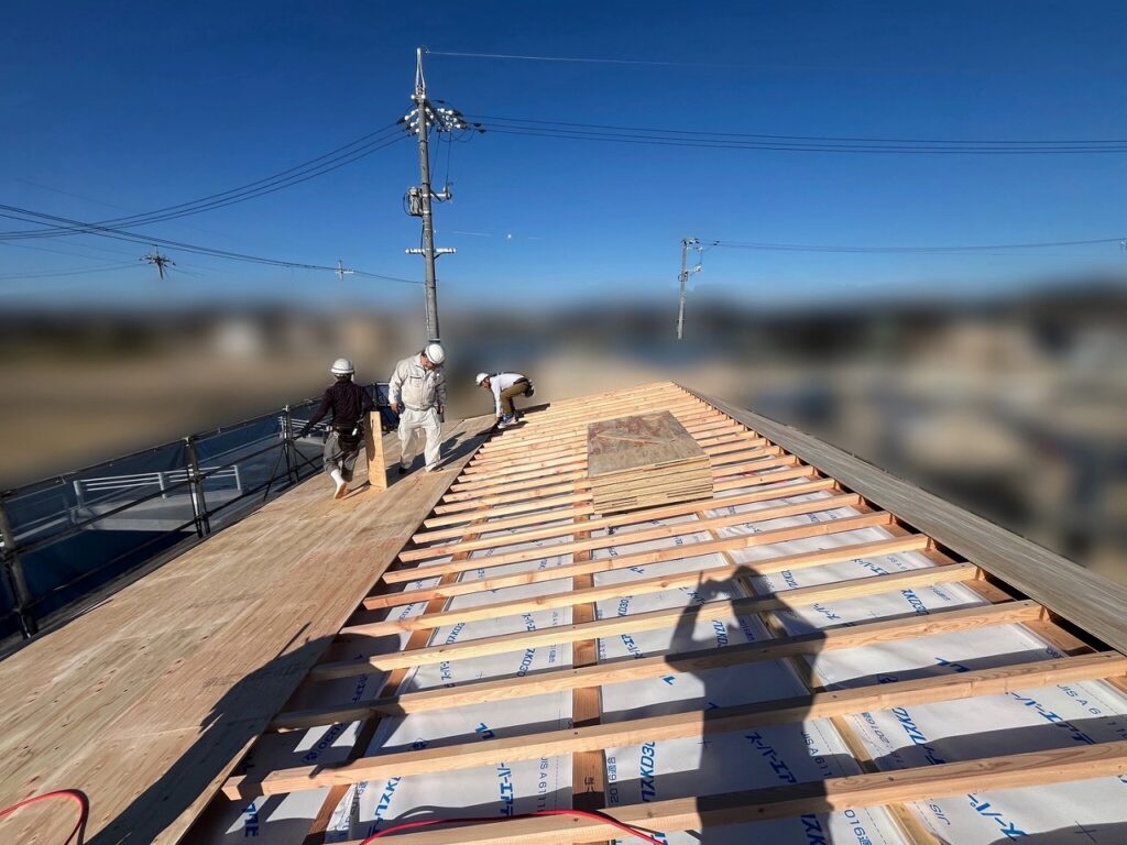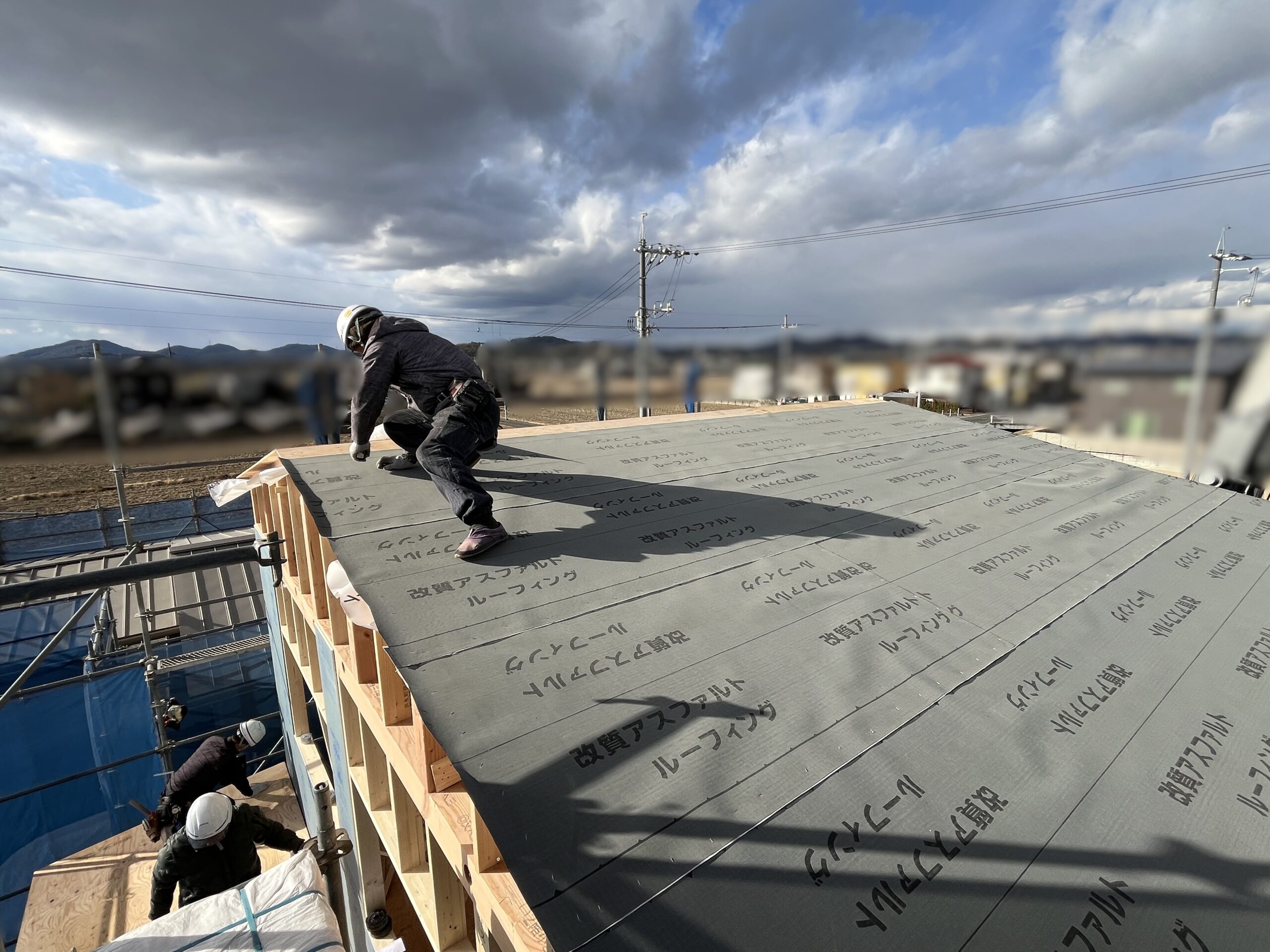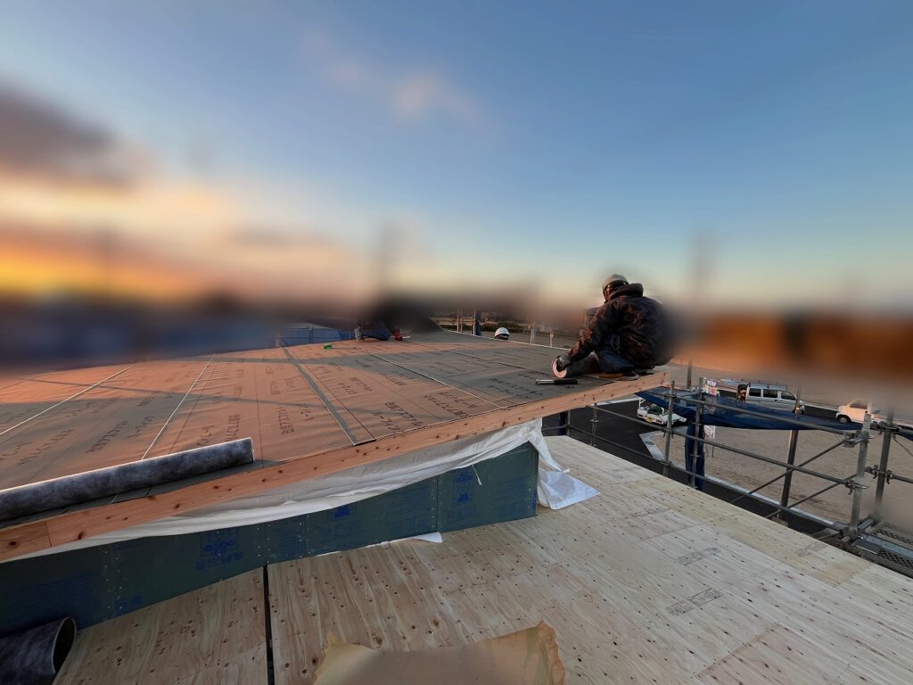 夕方には屋根の防水まで終え、一日がかりの棟上げ工事は無事に終了です!