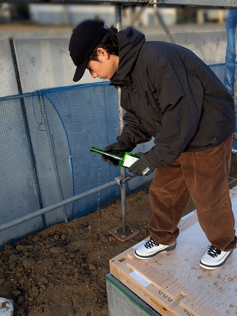 まだ土台の状態のお家の上で、木槌を持っての記念写真をパシャリ📷🎶