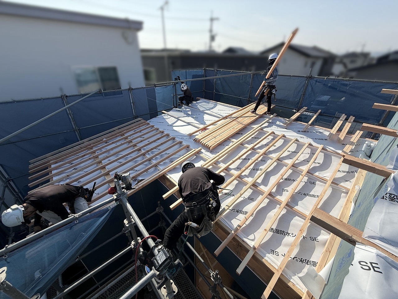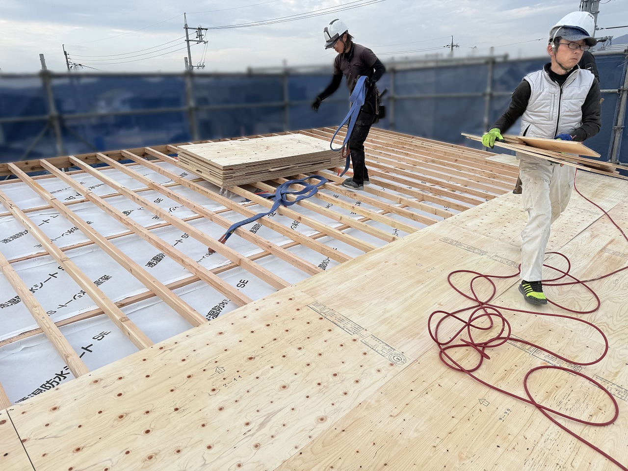 夕方には屋根のかたちも出来上がり、防水シートまで施工して、この日の工事は無事完了!