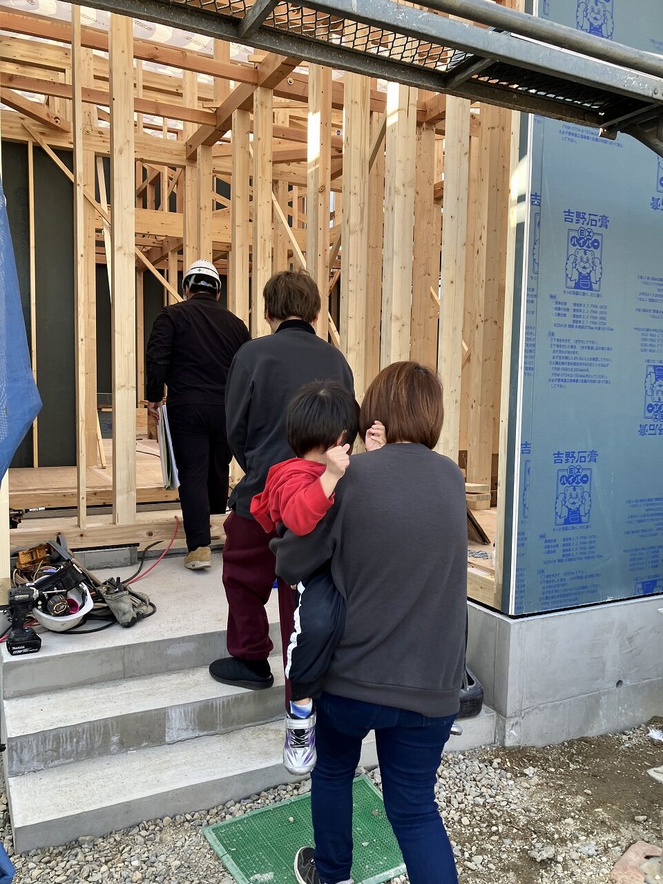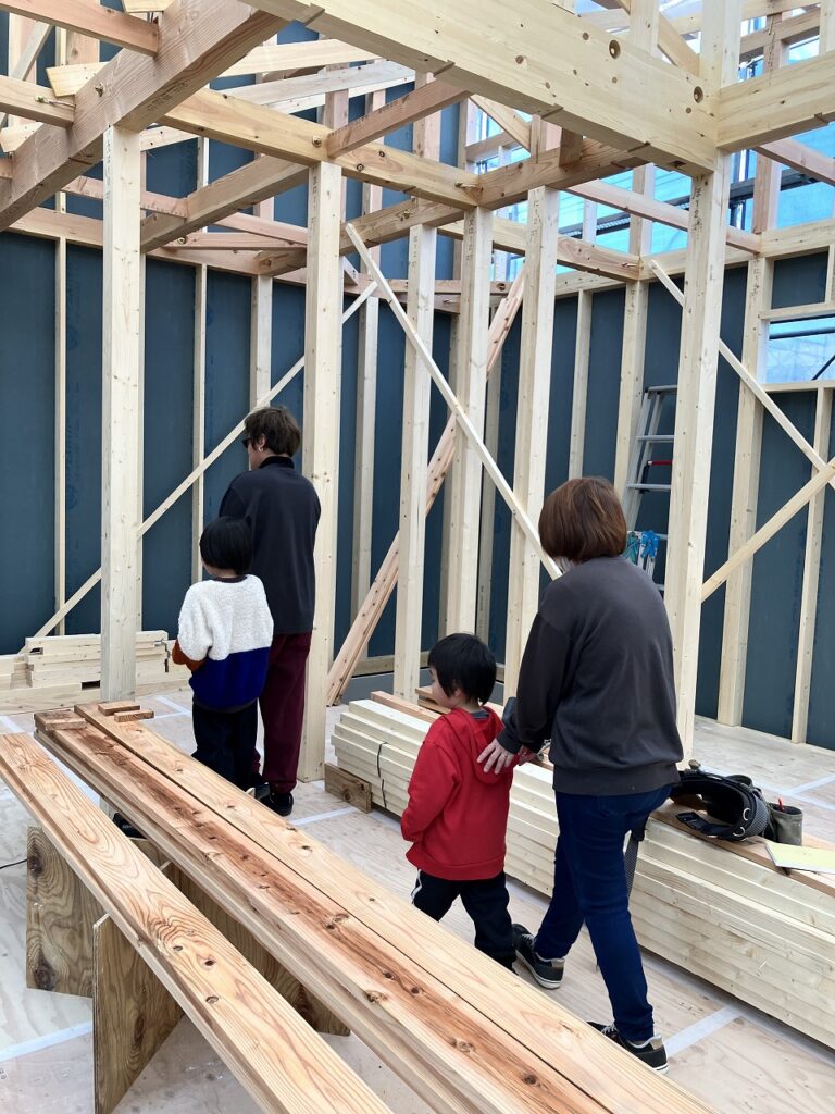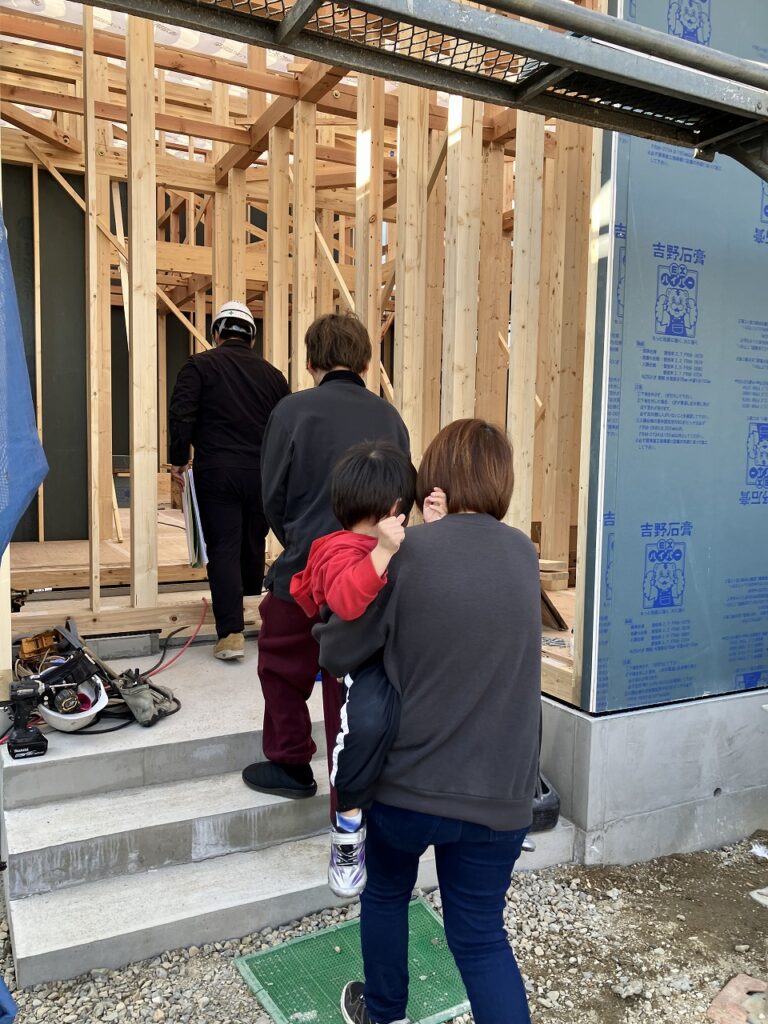 お家のすぐ近くには広場があり、棟上げしている横ではお子さんお二人が元気いっぱいに走り回っていました。