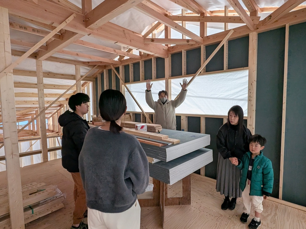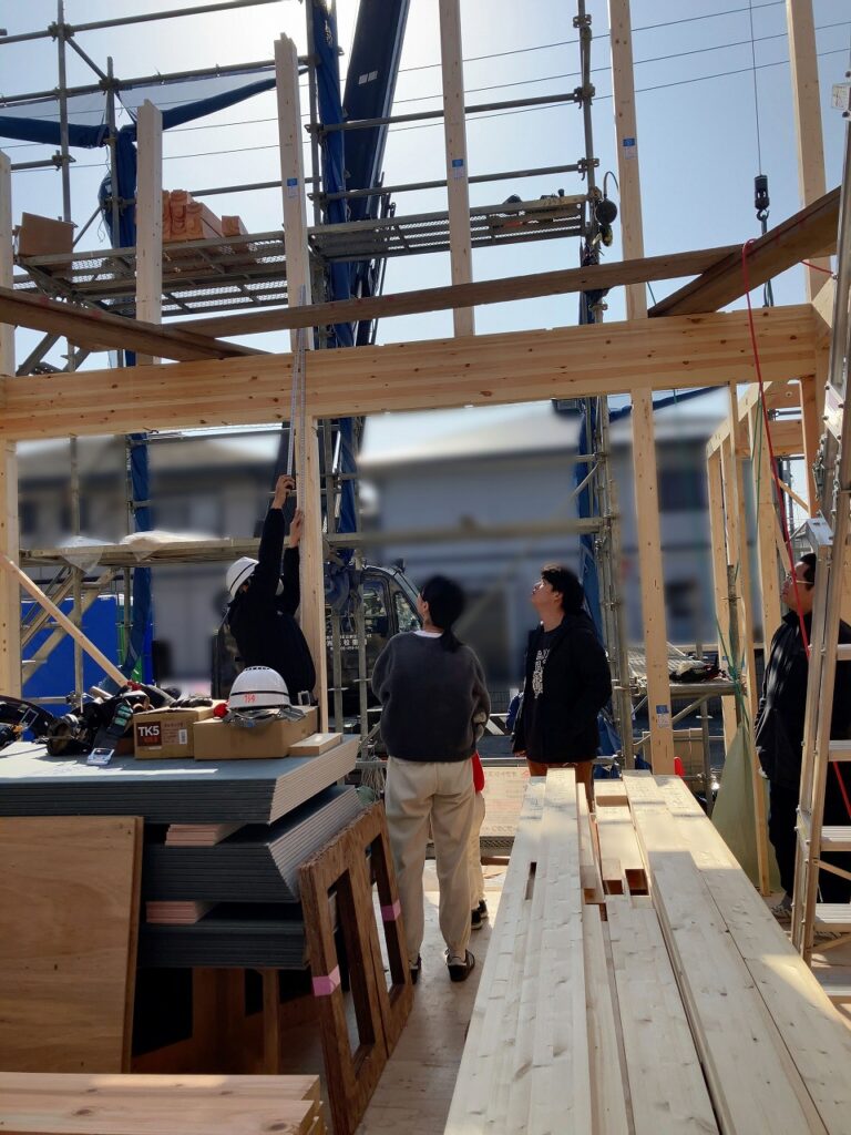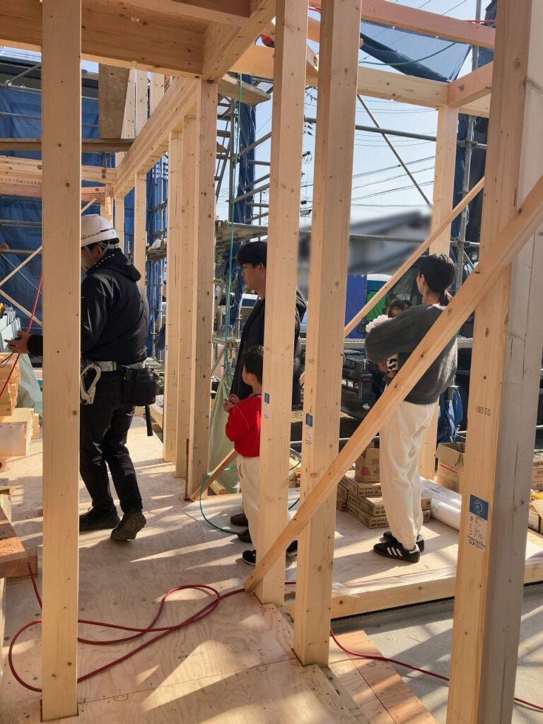 主要な梁まで組みあがったところで、お施主様にも建物の中へ入っていただきました。