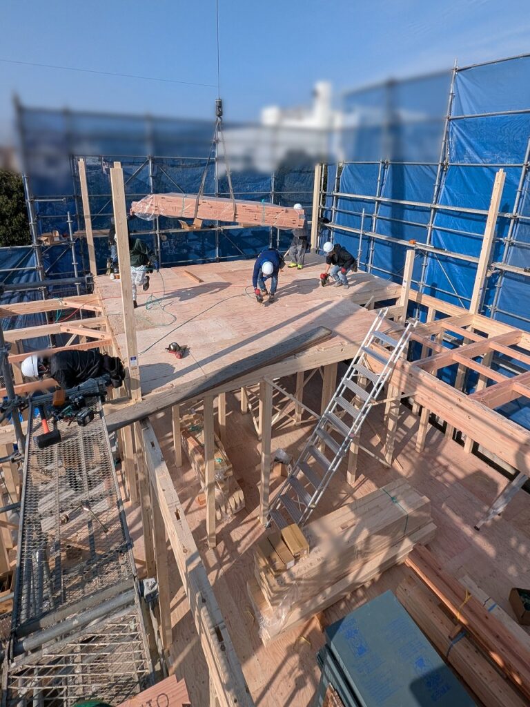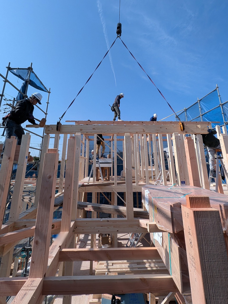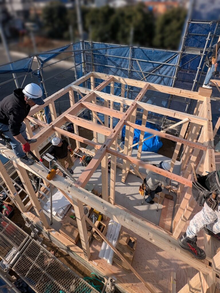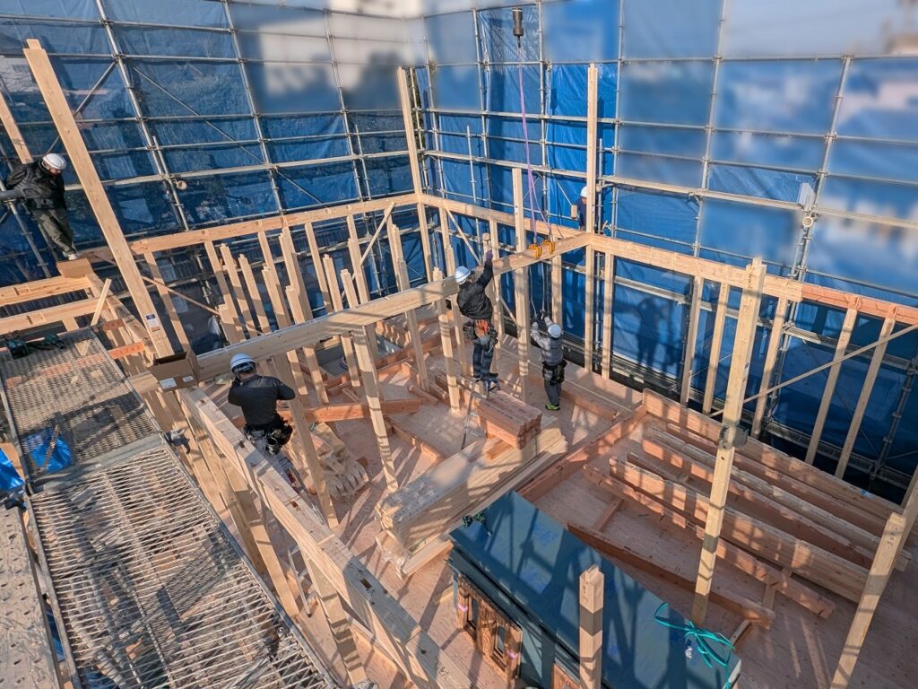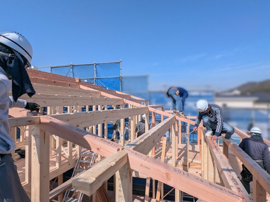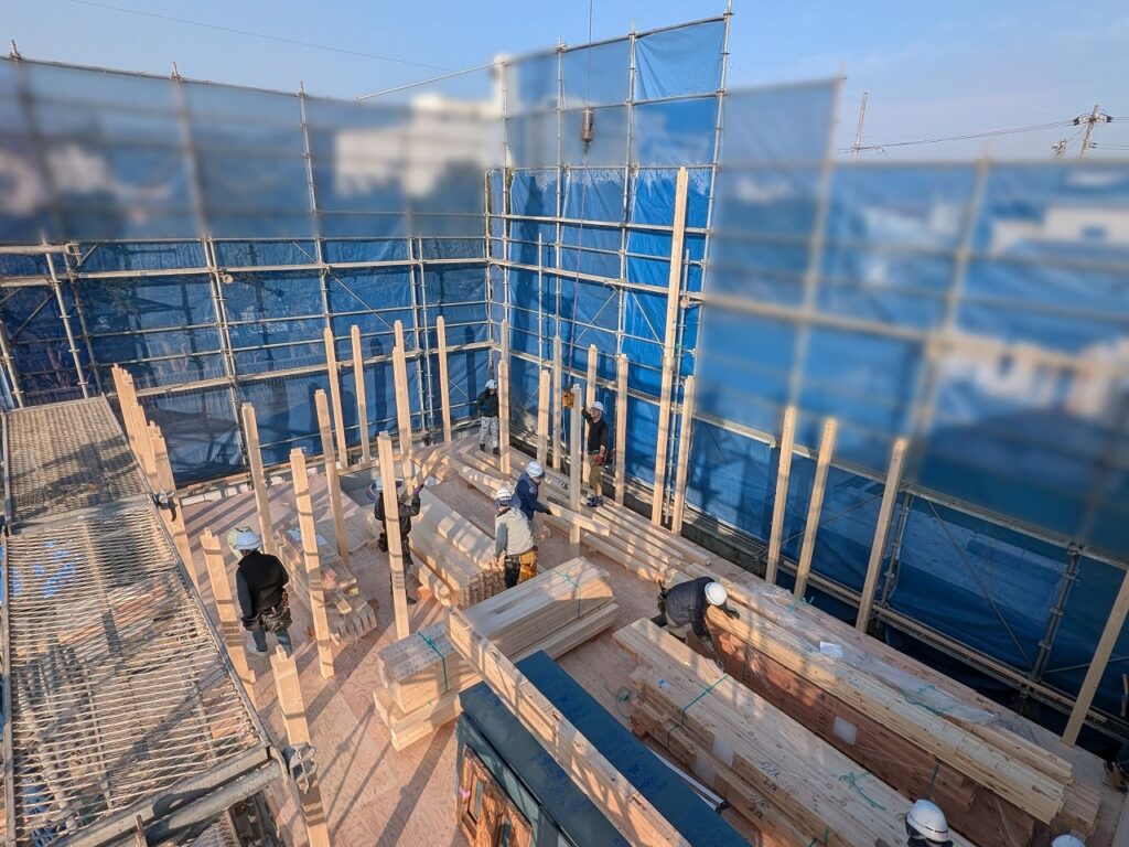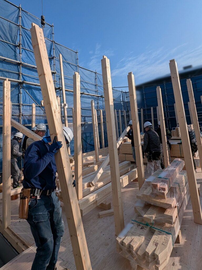 大工さんたちが一斉に動き出し、重たい柱を軽々と持ち上げ、次々と建てていきます。