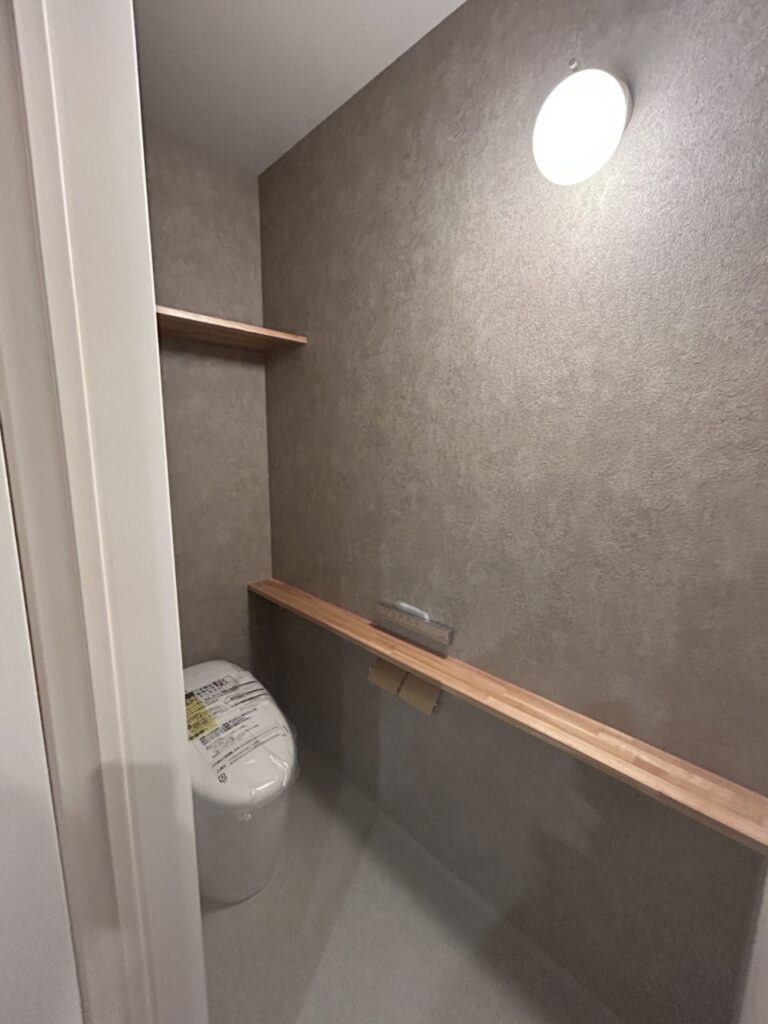 トイレには横にカウンターを設け、ペーパーストックや芳香剤などを置けるようにしました。