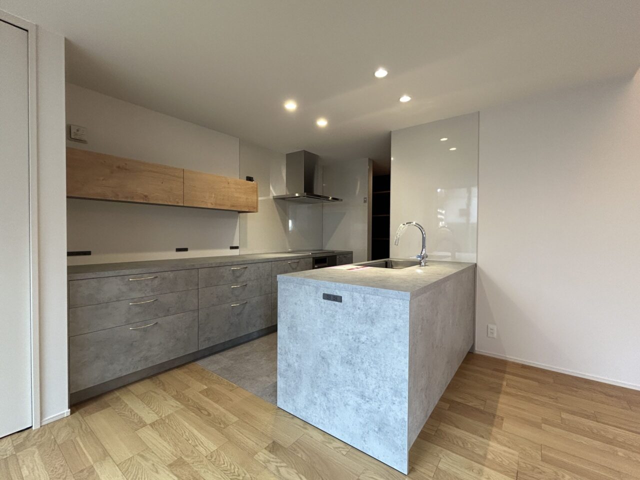吊戸棚は床材に合わせてオークナチュラルで統一し、全体にまとまりを持たせました。