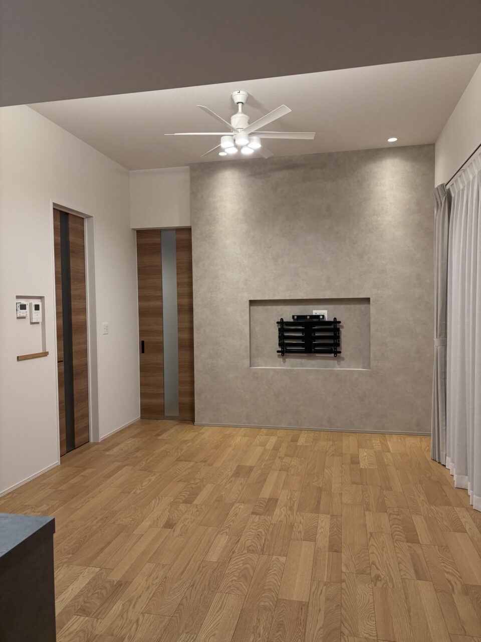 テレビ背面にはニッチを設け、壁掛け金具がそのくぼみの中に収まるようにしています。