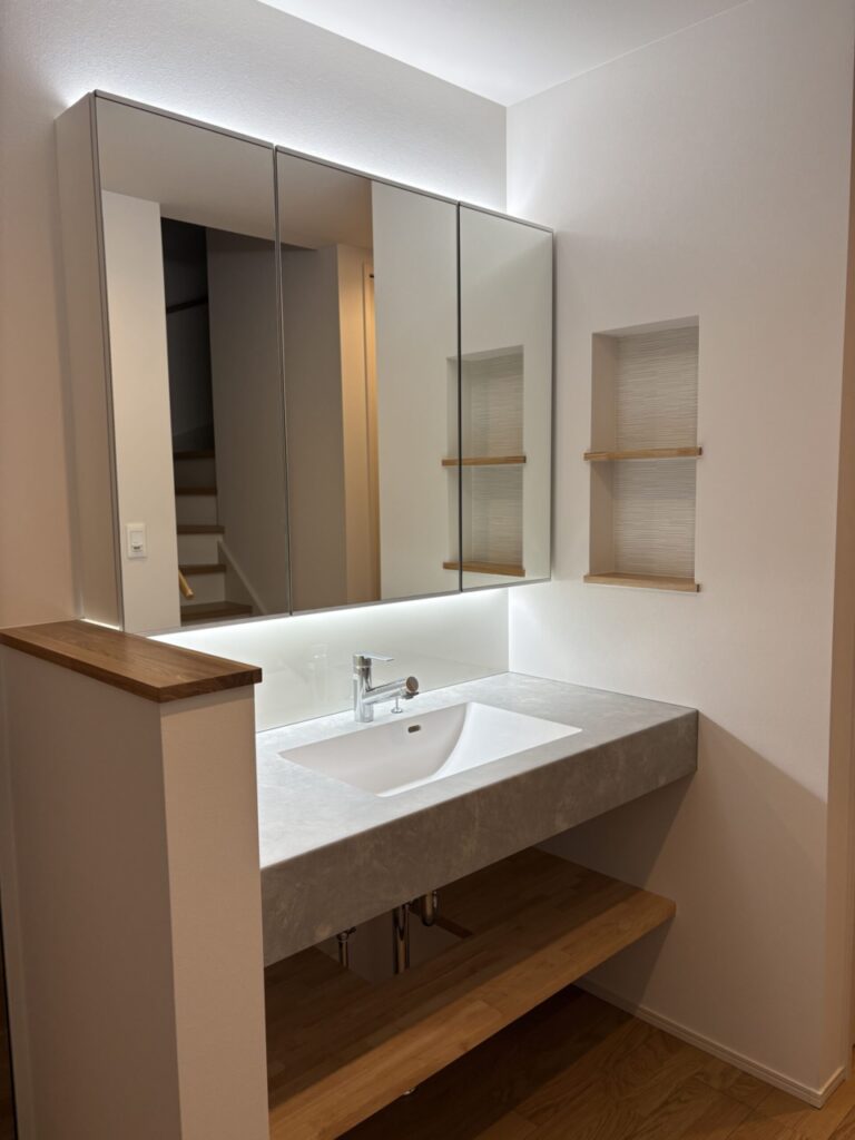 洗面カウンターは、奥様が悩みに悩んで選ばれたモルタル調に!