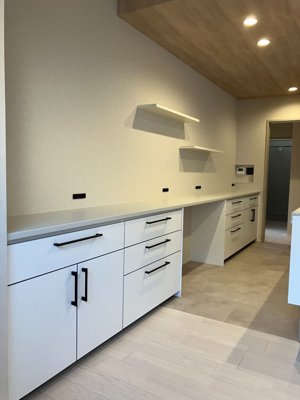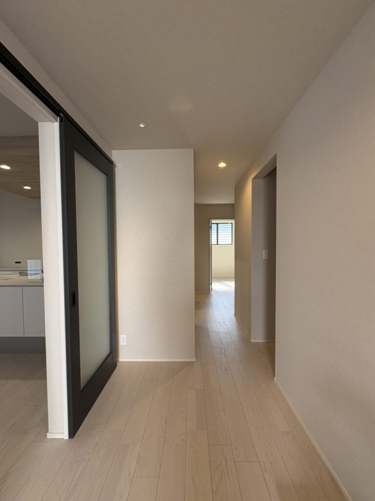 キッチンから見ると、フローリングの貼り方向や暗めのクロスの効果で、奥行きがあるように感じられますね👀