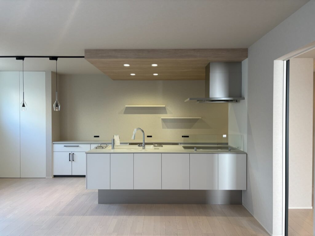 キッチン天井は、床材に近い淡いグレーの木目クロスに。