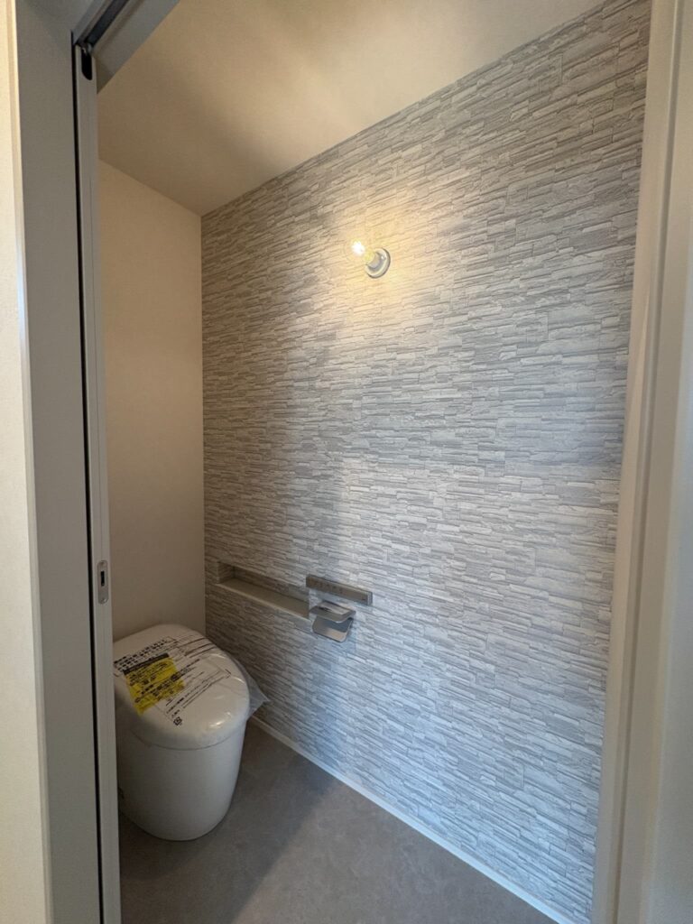 トイレには、ご夫婦が気に入られたタイル調のクロスを。