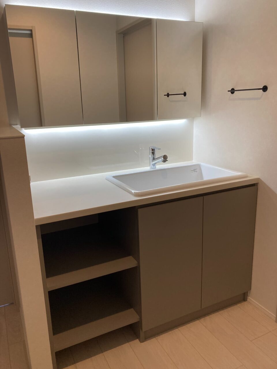 造作洗面台には病院用シンクを採用。