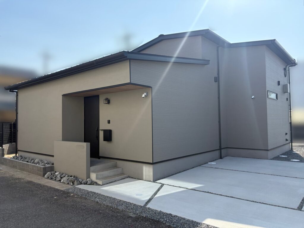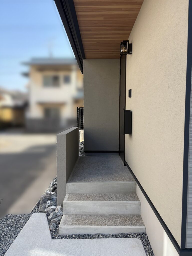 玄関側はグレーの塗り壁にし、お庭・駐車場側は塗り壁に近い色味のサイディングに。