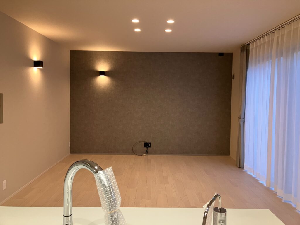 TV背面のアクセントクロスには、ご主人お気に入りの暗めのグレーのクロスを採用!
