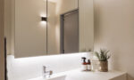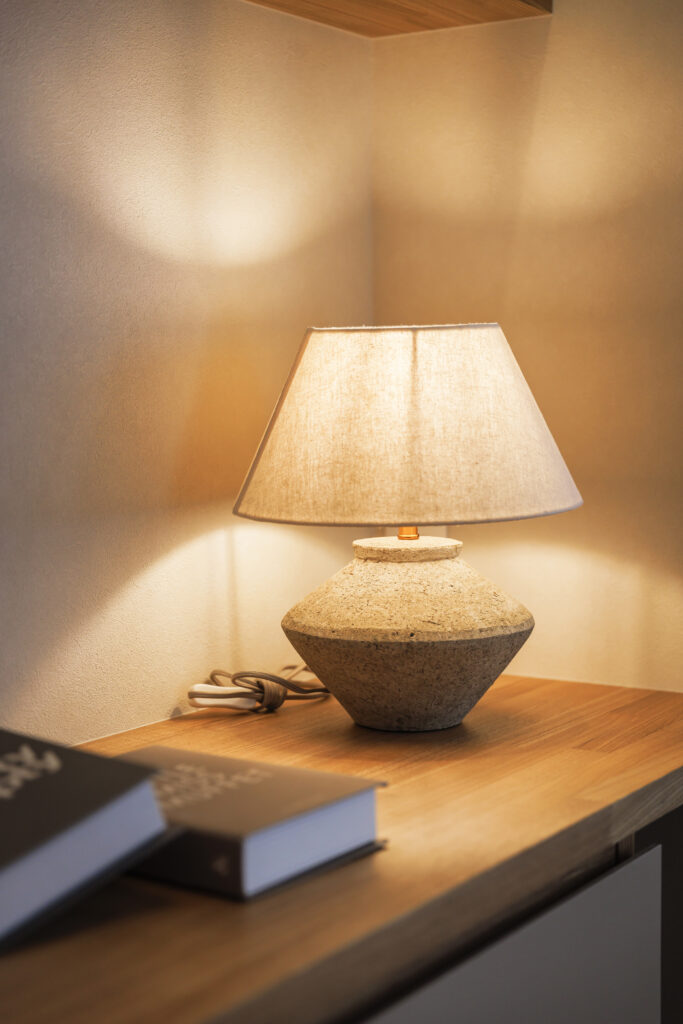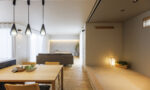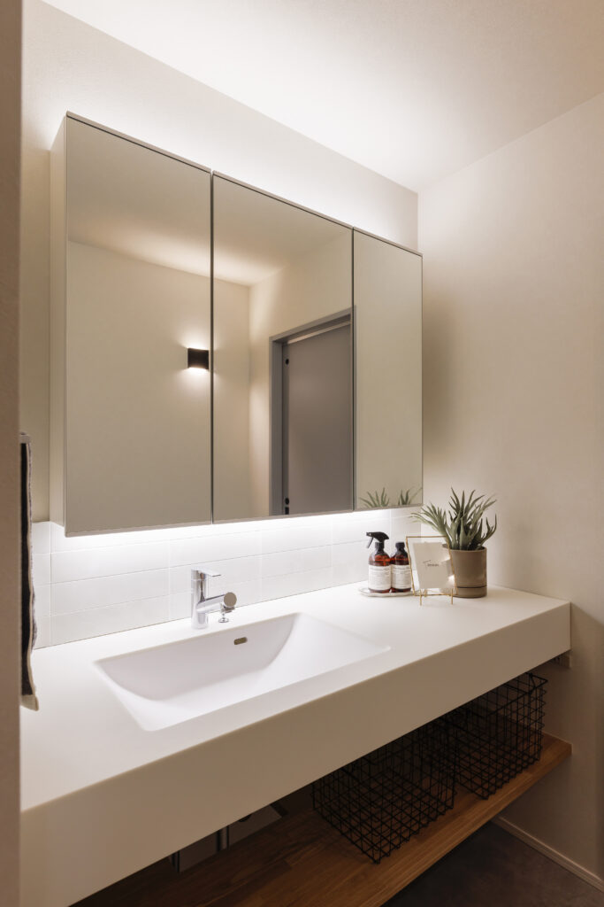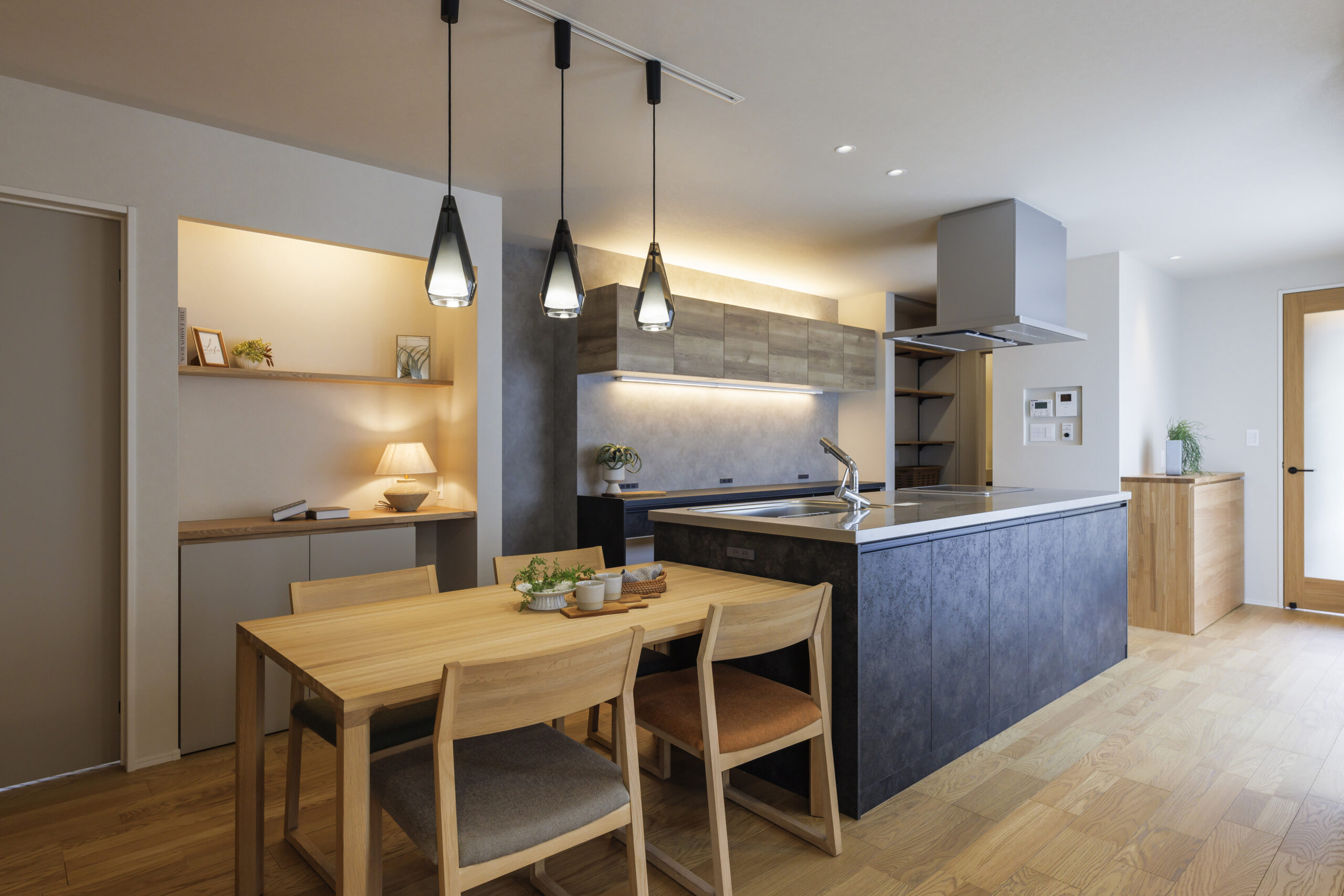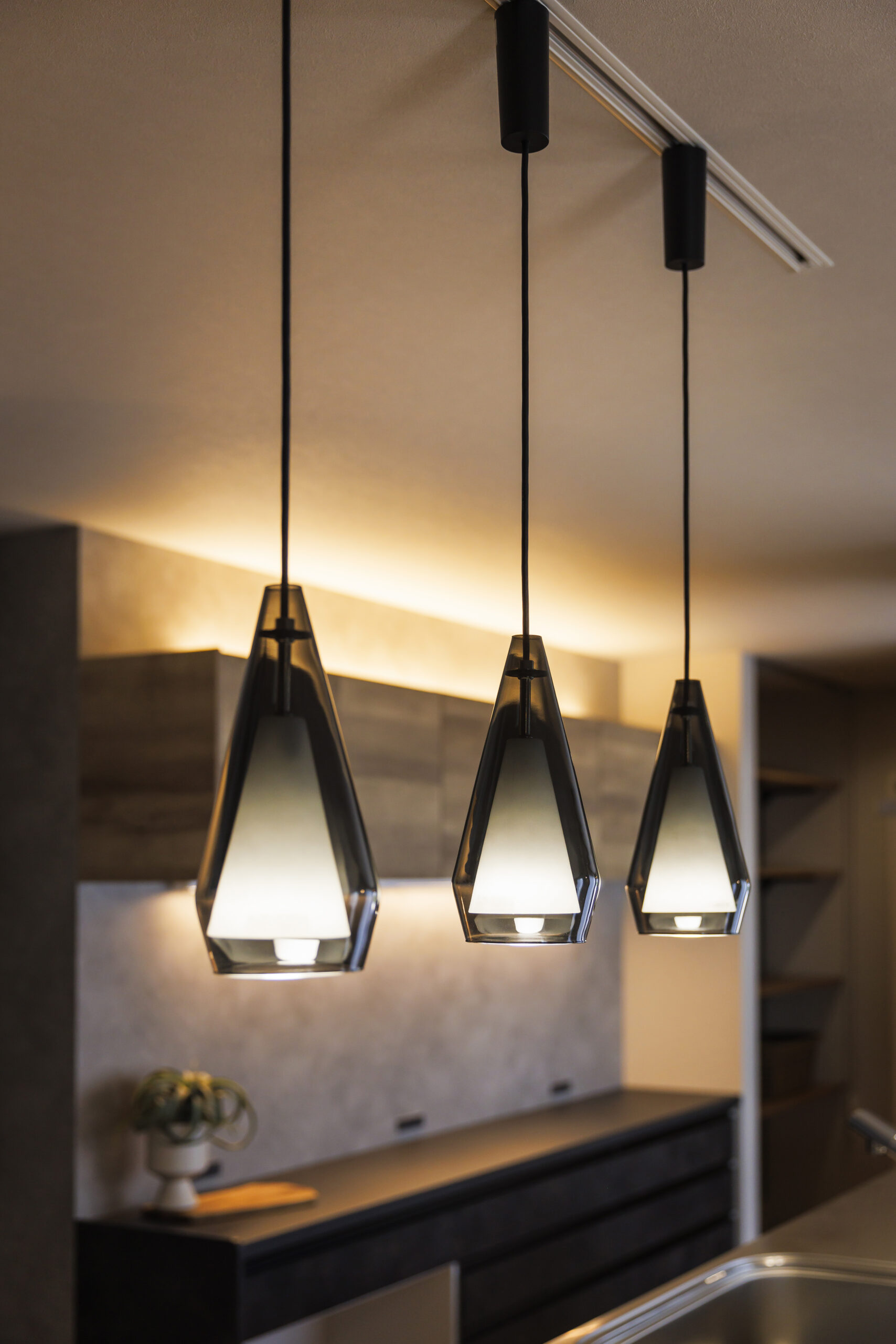 カウンター収納と間接照明がアクセント。使いやすさとデザイン性を両立しています