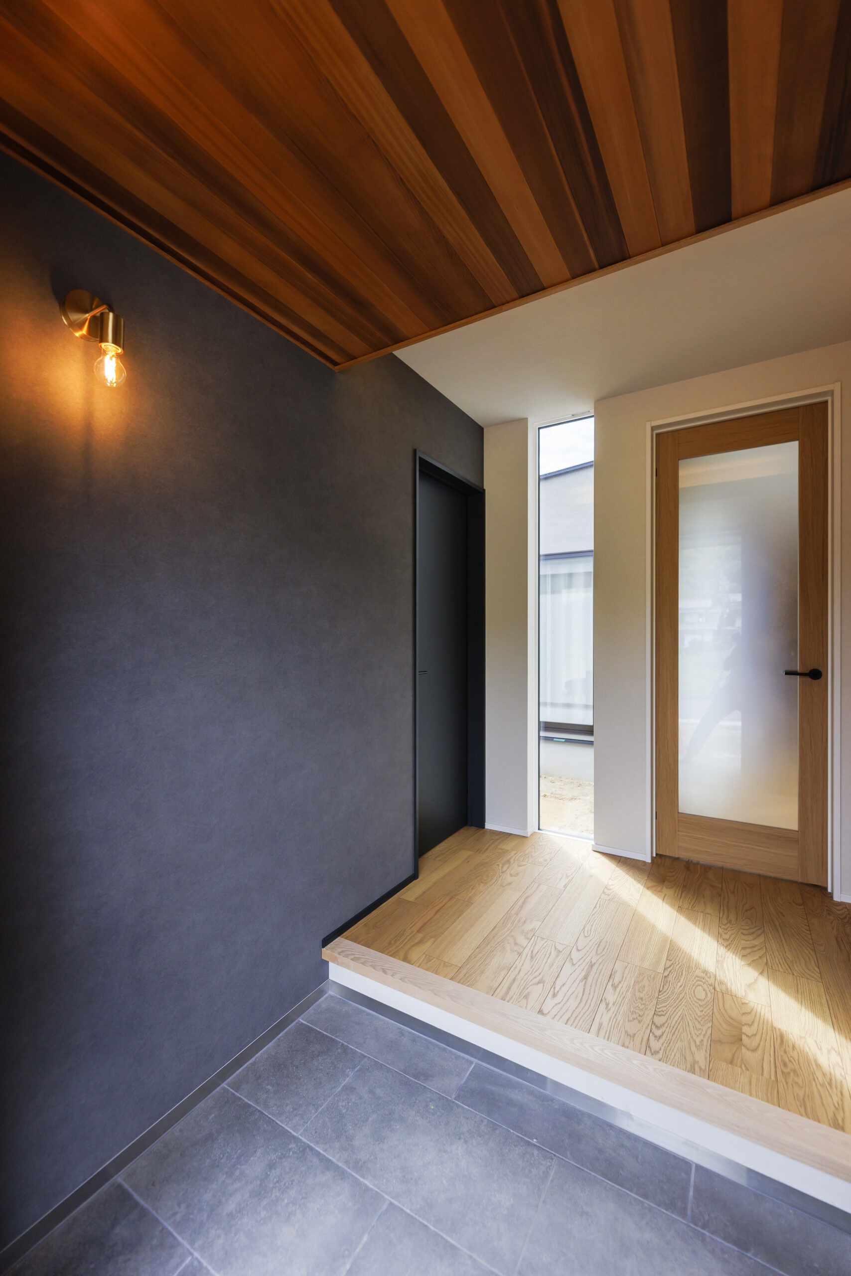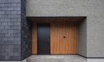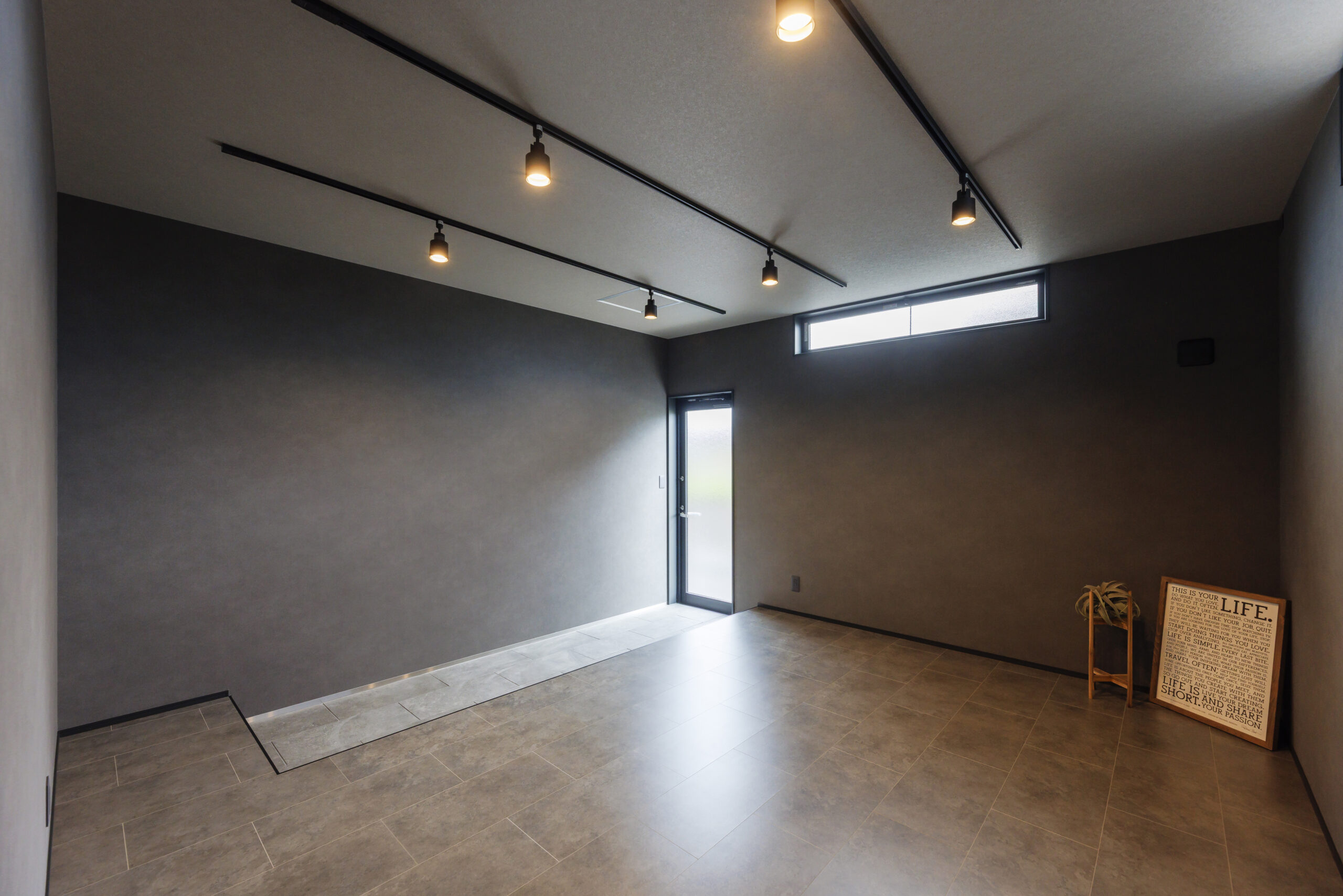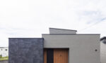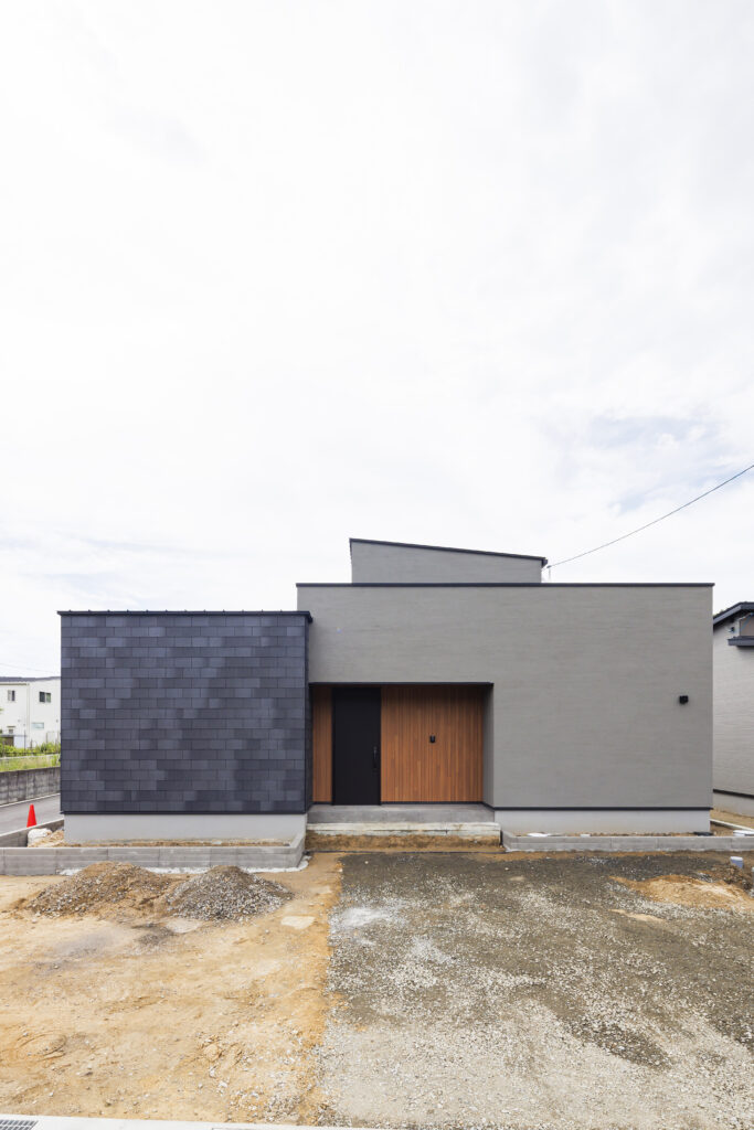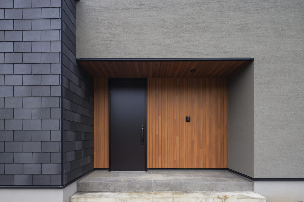 重厚感のあるグレーの外壁に、板張りやブリックタイルをアクセントとして組み合わせた外観は、素材の質感を活かした落ち着きのある佇まい。道路や周囲からの視線を遮りながら、プライベートな空間をしっかり確保した設計になっています。